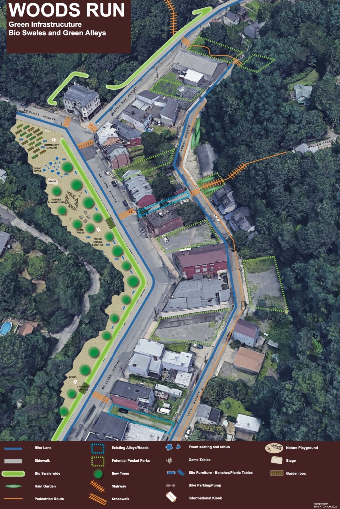 In 2022, the Woods Run Watershed Taskforce, Pittsburgh Parks Conservancy, and the National Park Service partnered to create a blueprint for the Woods Run Green Corridor. This initiative envisions the restoration of ecological habitats on vacant and underutilized land throughout the watershed. By transforming these spaces, the Green Corridor aims to manage stormwater more naturally—keeping excess water out of the overburdened sewer system.