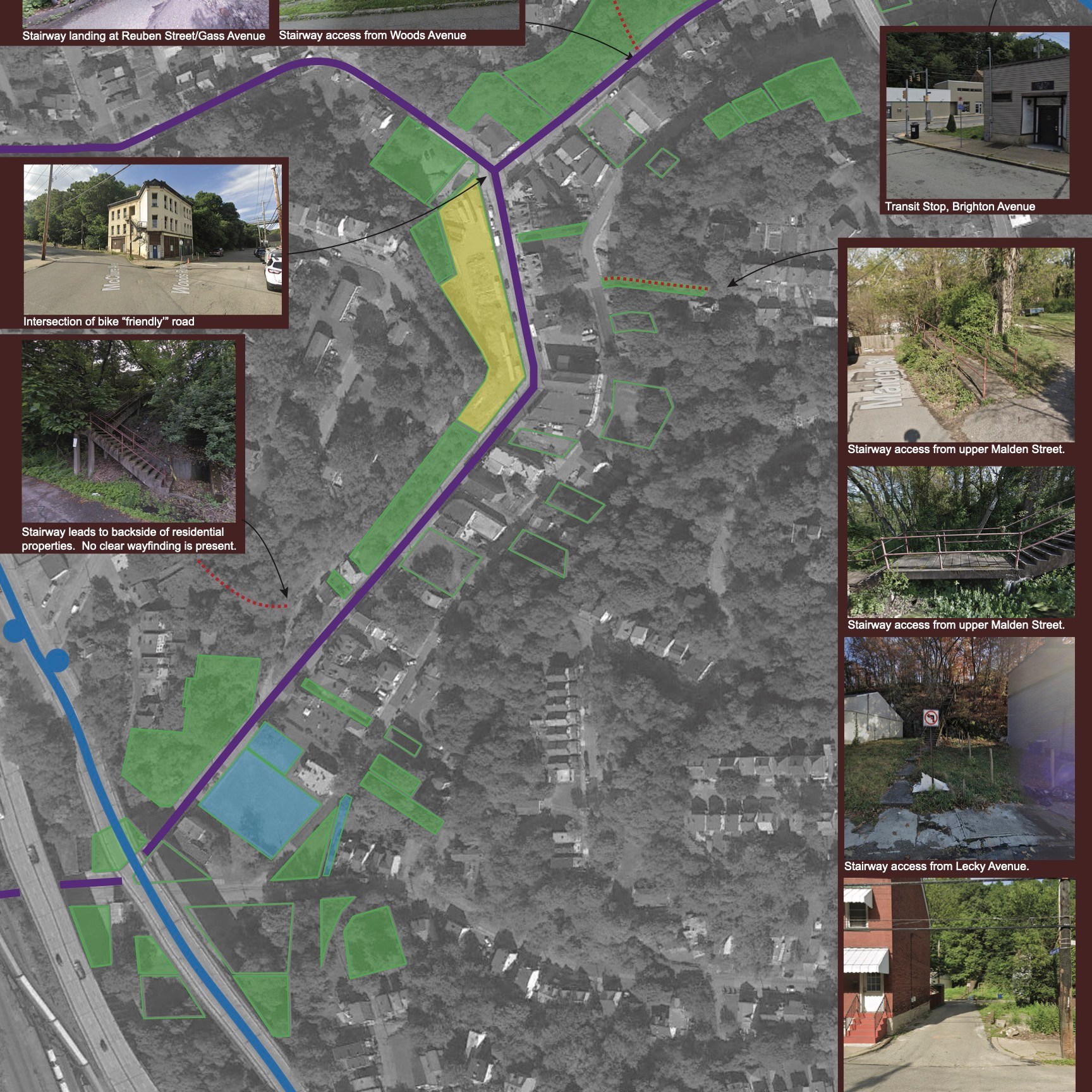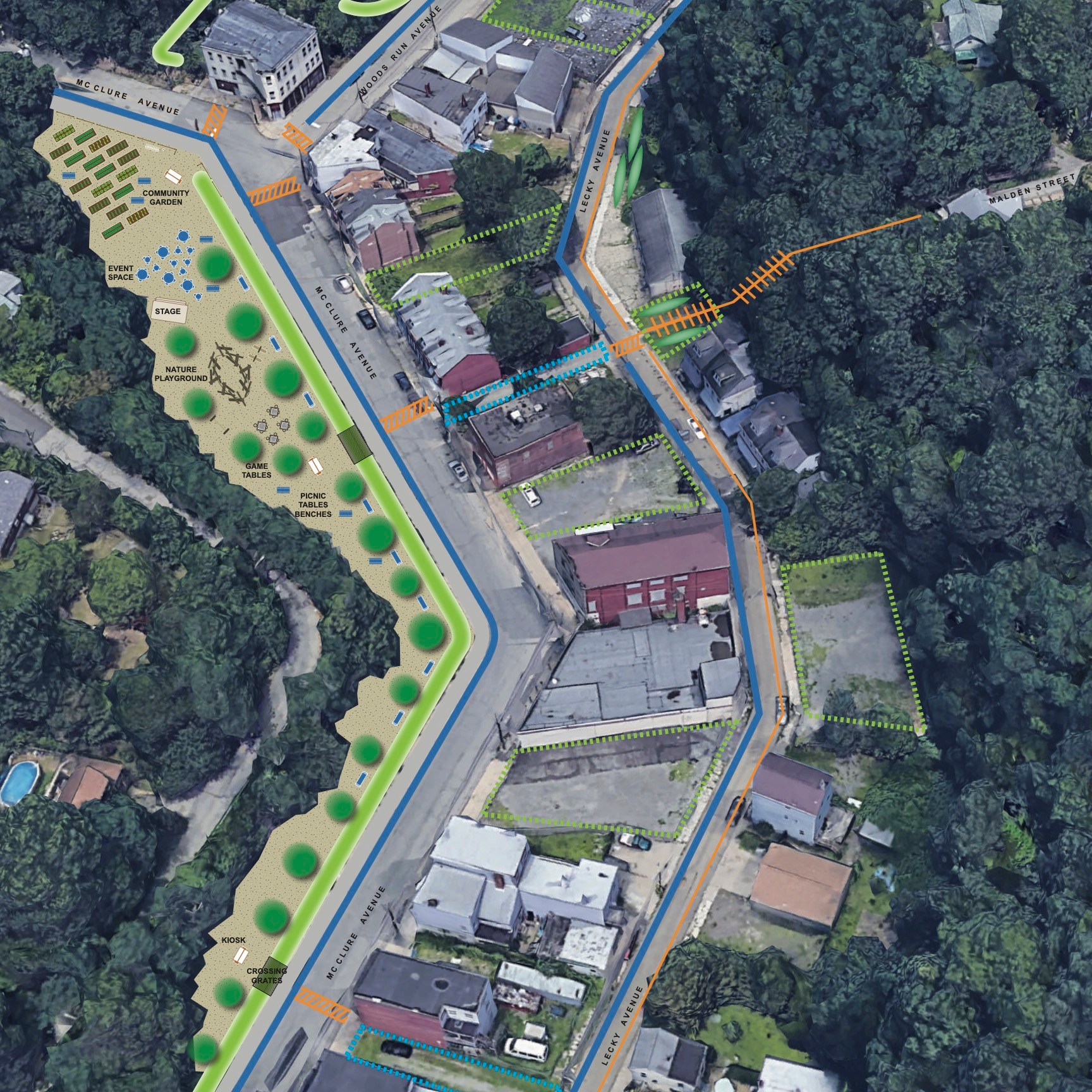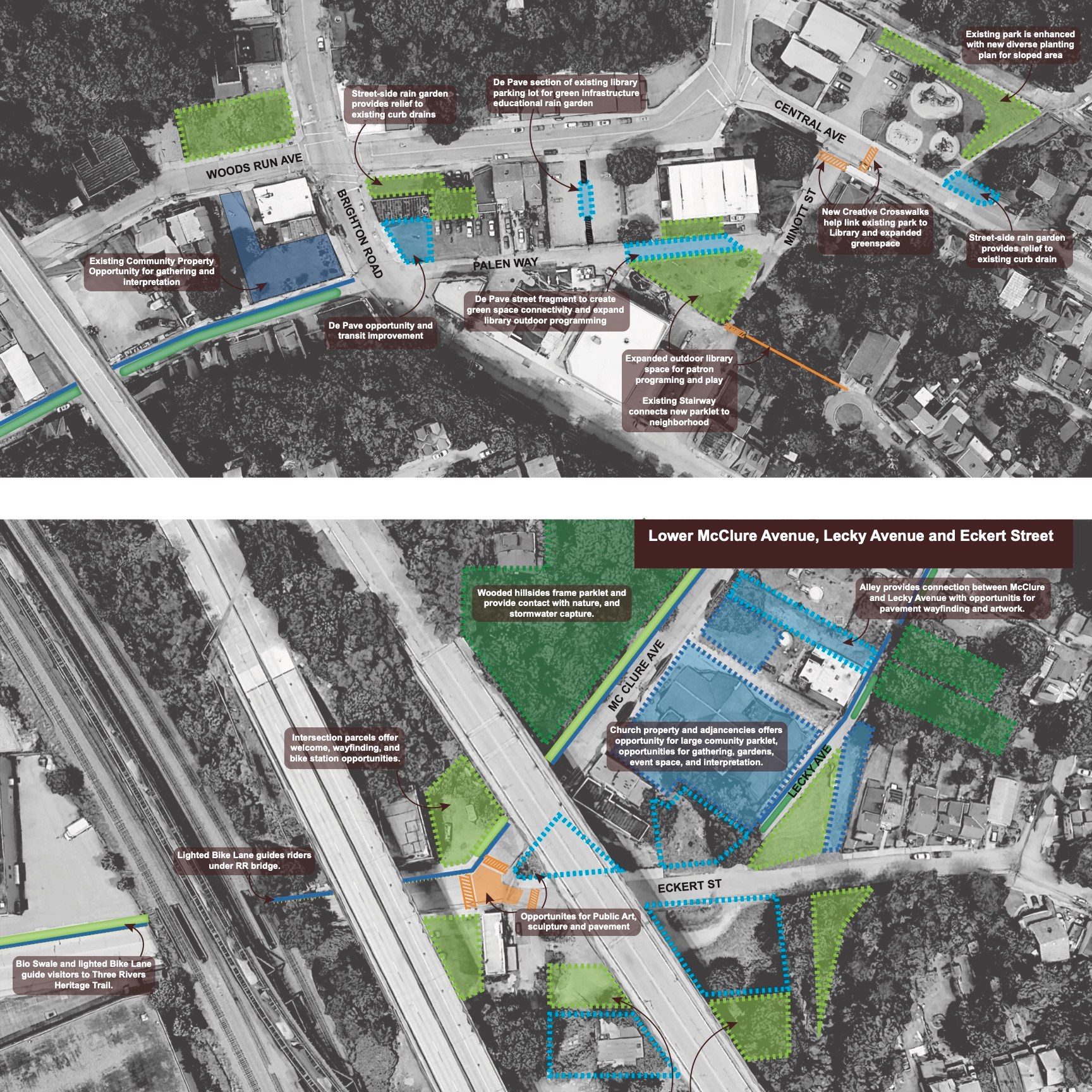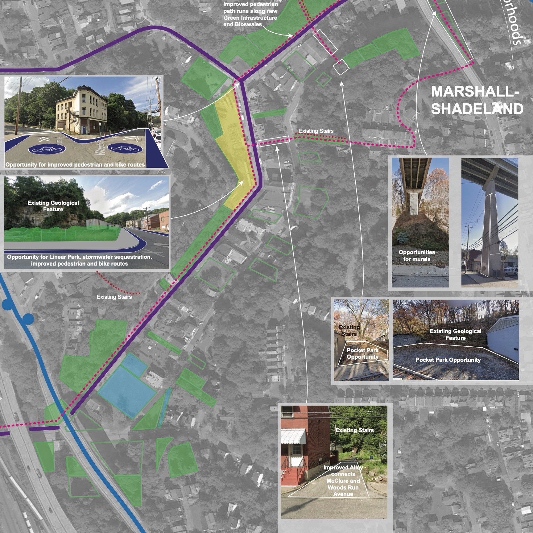 Thanks to support from the National Park Service and the Pittsburgh Parks Conservancy, the Taskforce now has a set of compelling visual aids that illustrate this vision. These include large-format posters with aerial views of Marshall-Shadeland and the Woods Run watershed, overlaid with mapped “potential projects” that highlight key opportunities for green infrastructure, habitat restoration, and trail connections.