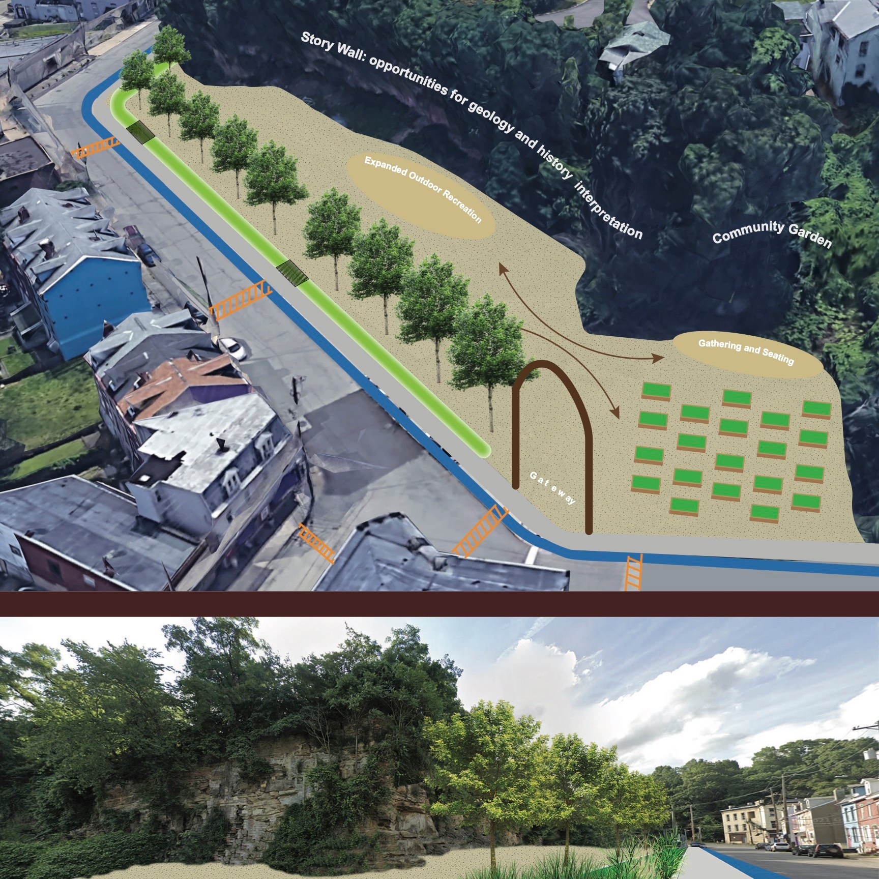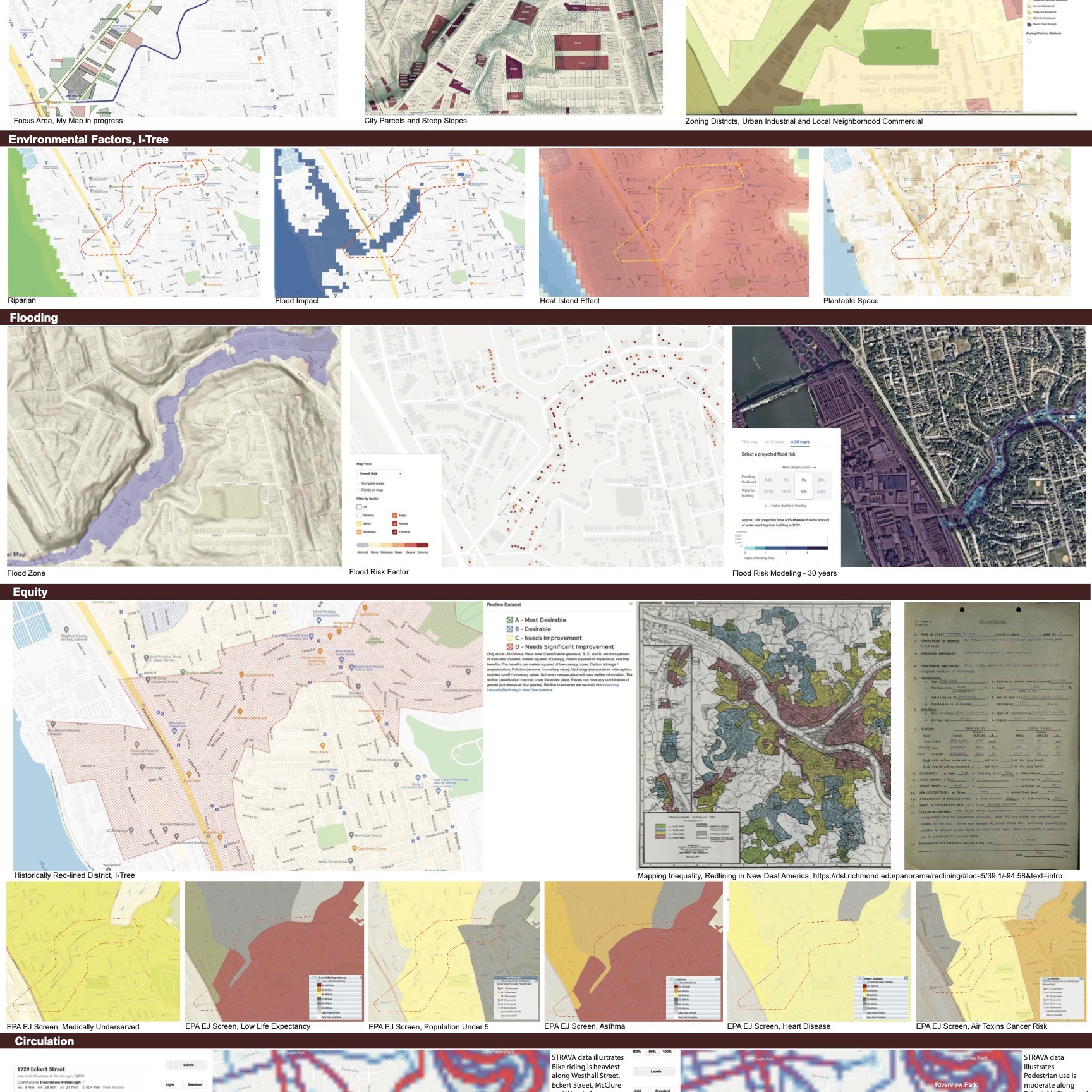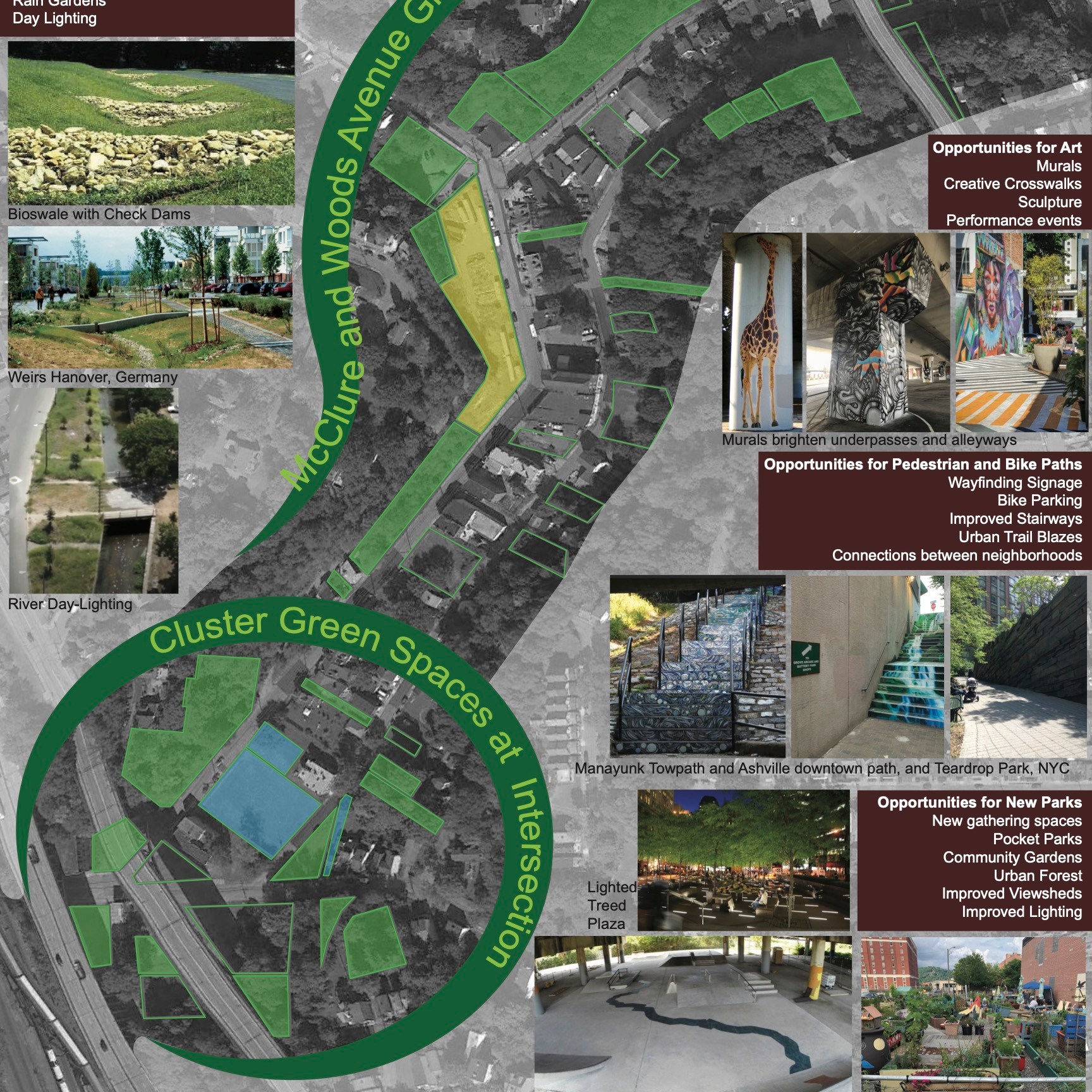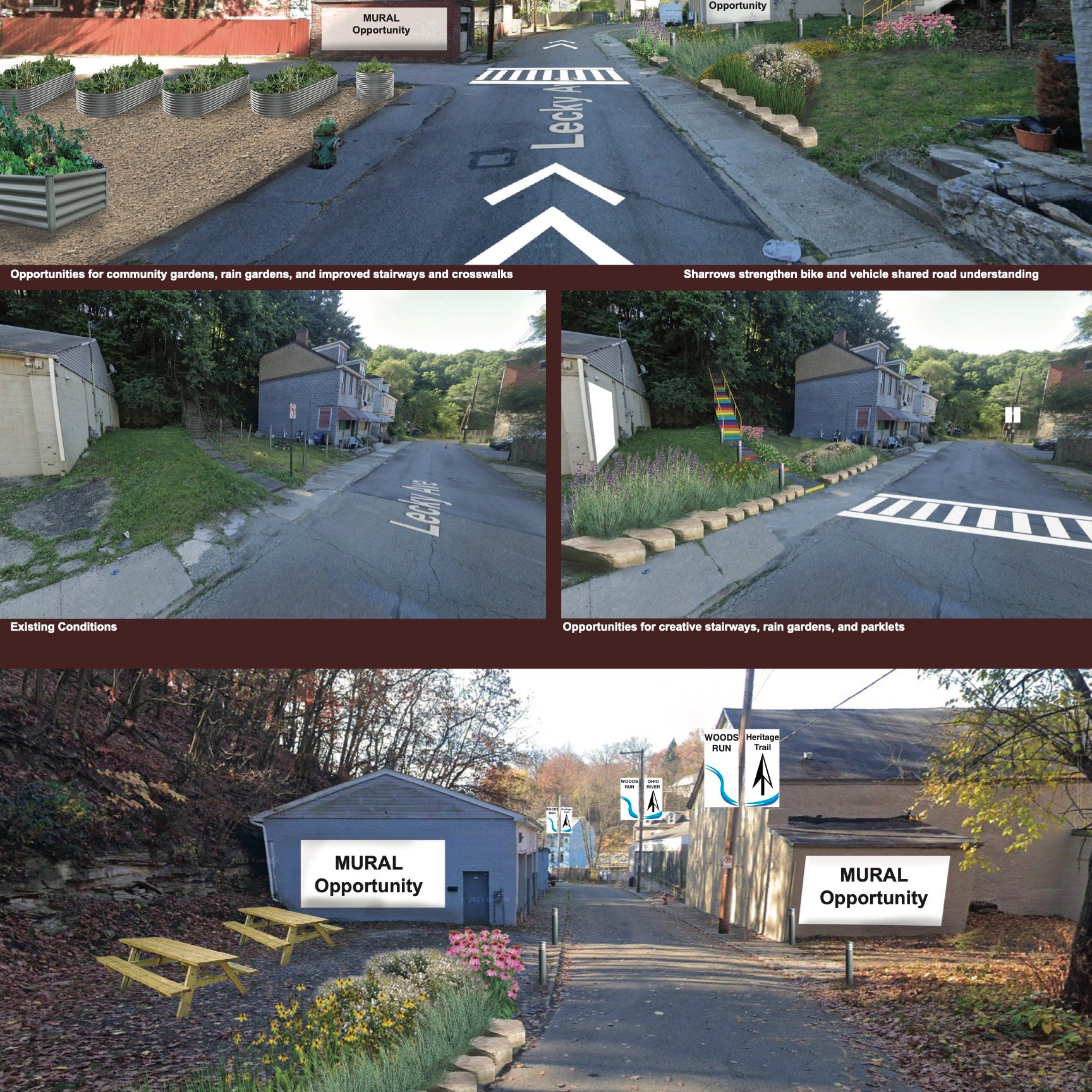 Thanks to support from the National Park Service and the Pittsburgh Parks Conservancy, the Taskforce now has a set of compelling visual aids that illustrate this vision. These include large-format posters with aerial views of Marshall-Shadeland and the Woods Run watershed, overlaid with mapped “potential projects” that highlight key opportunities for green infrastructure, habitat restoration, and trail connections.