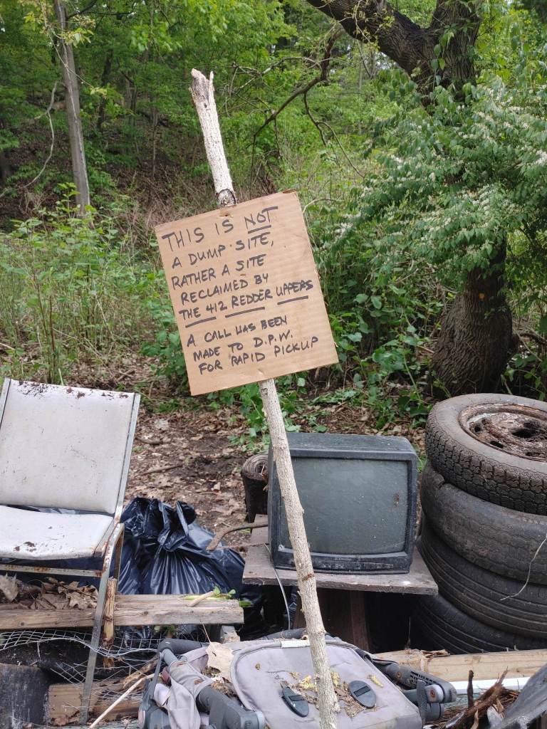 Trying to get back into the swing of things after getting derailed by life and weather we had a 3 person cleanup this month. 6 bags of trash, 1 TV, and 2 5 gallon buckets of paint. Woods Run Ave is much cleaner at the end of the day!