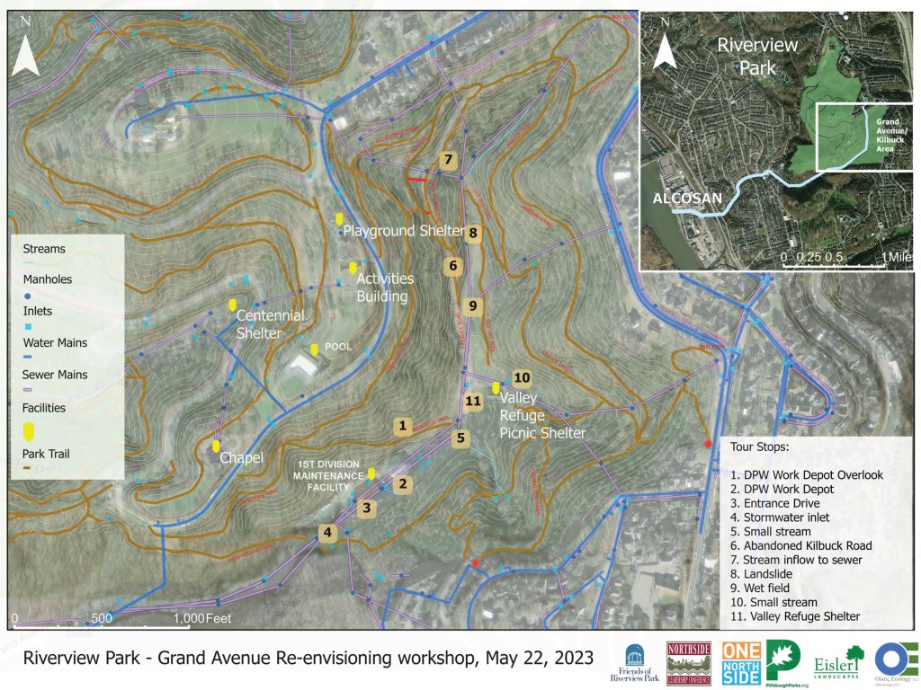 On May 22nd members of URBAN TRAILS attended a planning meeting at the Valley Refuge shelter in Riverview Park. The event was hosted by the Friends of Riverview Park and The Pittsburgh Parks Concervancy to discuss the revitalization of the Grand Ave Entrance to Riverview Park in the neighborhood of Marshall Shadeland. This was a continuation of a process that began in 2020 prior to the covid 19 pandemic and at this meeting we walked the area and discussed different ideas for moving forward.